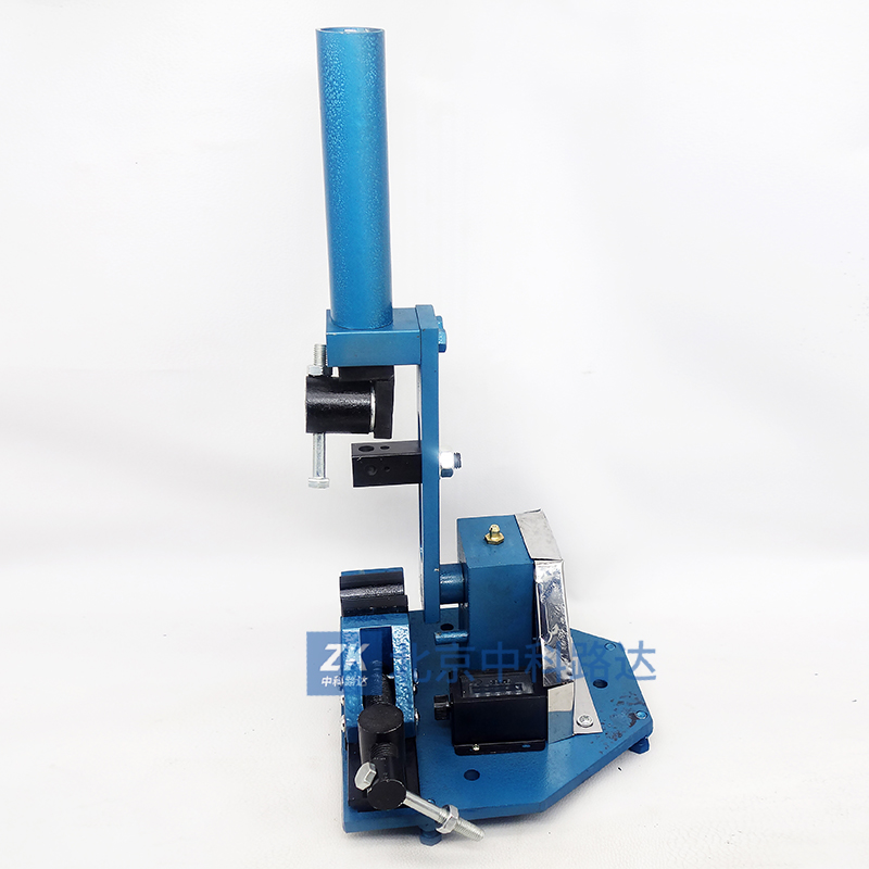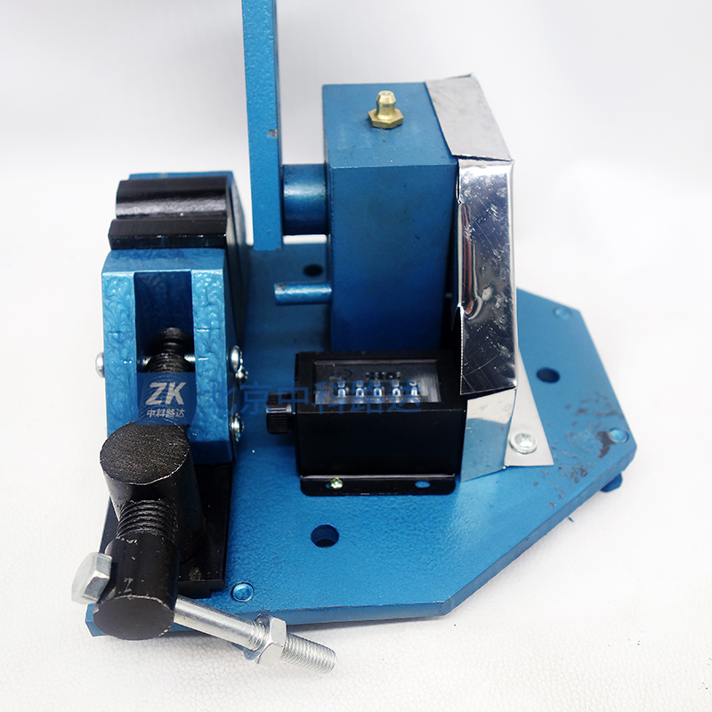 4、將搖臂處于垂直位置,并以此作為試驗的起始狀態(tài)將試樣先穿入兩夾片中底板的孔內。然后垂直向上從撥桿的下部穿過撥桿孔,再穿入上夾頭至頂部,轉動上夾頭手柄把線材上端夾緊