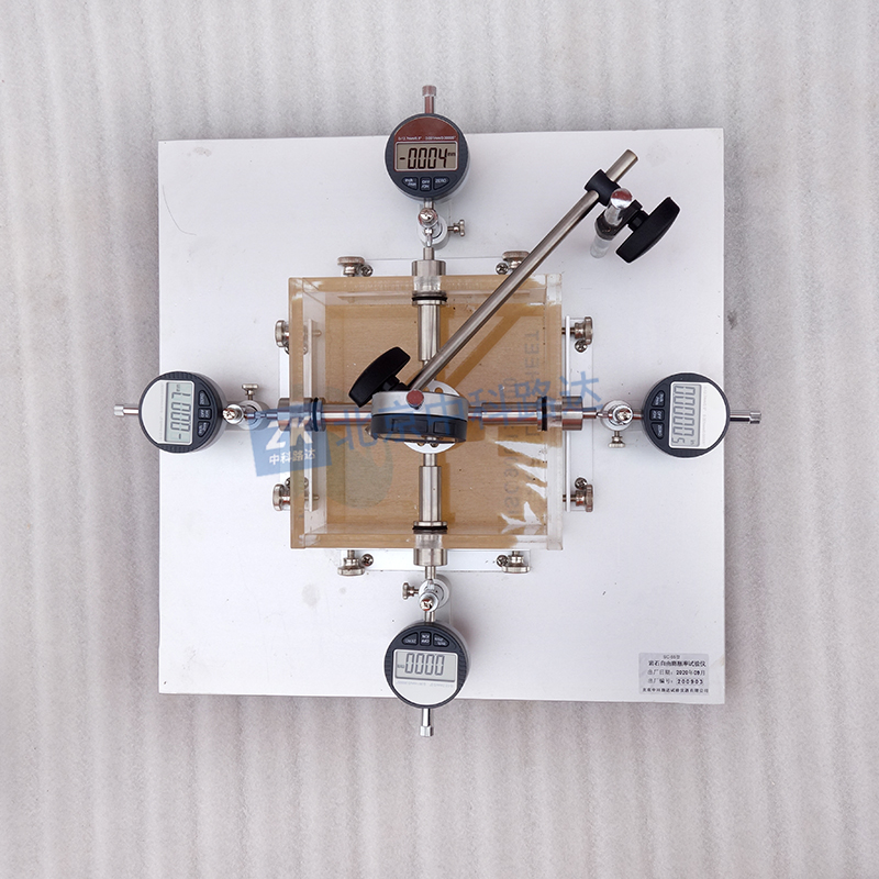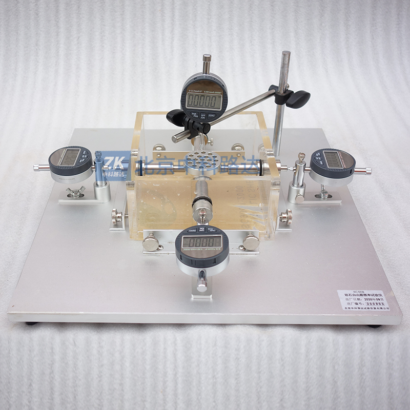 巖石自由膨脹率試驗儀是巖石試件在浸水后產(chǎn)生的徑向和軸向變形分別與試件直徑和高度之比,以百分數(shù)表示。該試驗儀器為千分表數(shù)字直讀式結(jié)構(gòu),適用于各類巖石膨脹性試驗中的側(cè)向約束情況下,軸向位移變化的試驗,配有透水板,千分表等試驗裝置。符合TB10115-2014《鐵路工程巖石試驗規(guī)程》和JTG E41-2005《公路工程巖石試驗規(guī)程》標(biāo)準(zhǔn)要求。