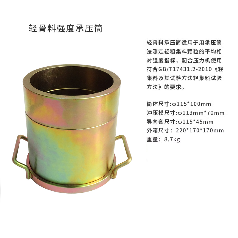 輕骨料承壓筒適用于用承壓筒法測(cè)定輕粗集料顆粒的平均相對(duì)強(qiáng)度指標(biāo),配合壓力機(jī)使用。符合GB/T17431.2-2010《輕集料及其試驗(yàn)方法輕集料試驗(yàn)方法》的要求。