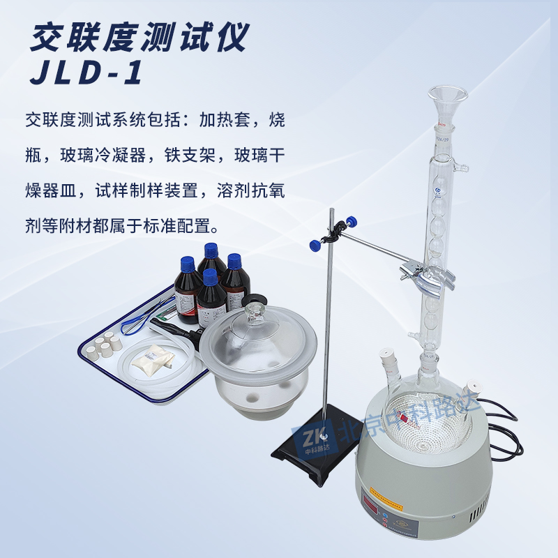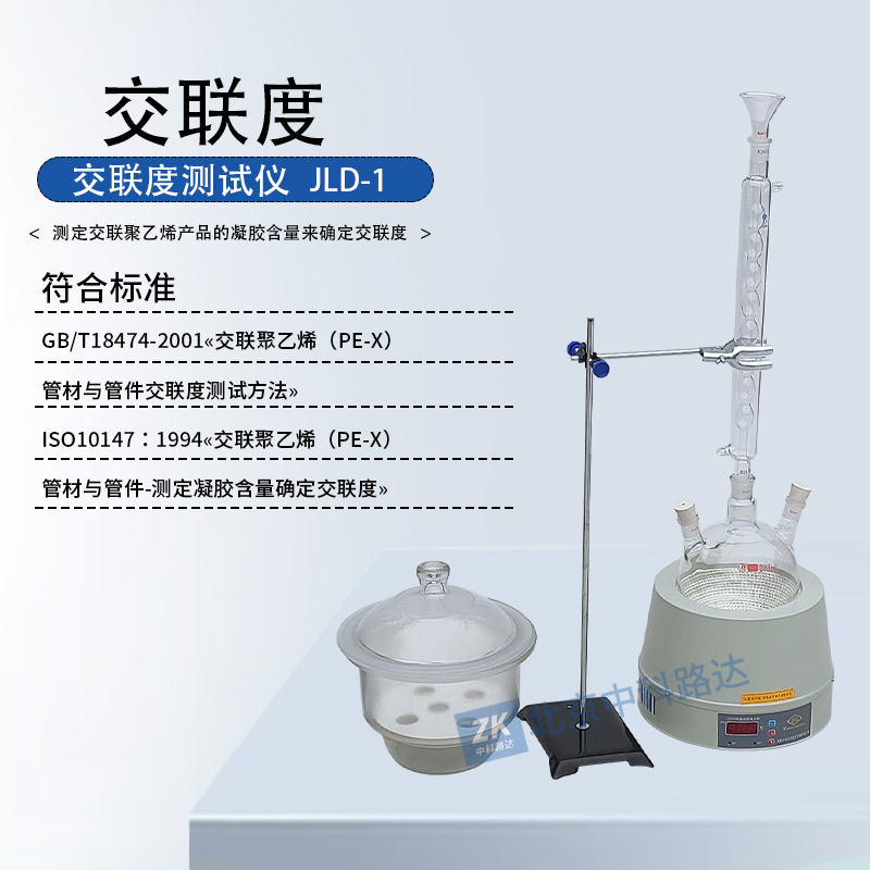 產(chǎn)品簡(jiǎn)介交聯(lián)度測(cè)試系統(tǒng)包括:加熱套,燒瓶,玻璃冷凝器,鐵支架,玻璃干燥器皿,試樣制樣裝置,溶劑抗氧劑等附材都屬于標(biāo)準(zhǔn)配置。1.1作用:JLD-I交聯(lián)度測(cè)試系統(tǒng)用作光伏組件封裝的EVA交聯(lián)、聚乙烯交聯(lián)(PEX)、天然高分子離子交聯(lián)及高分子結(jié)晶度等其他材料的測(cè)試,檢測(cè)其柔韌性、耐沖擊性、彈性、光學(xué)透明性、低溫繞曲性、黏著性、耐環(huán)境應(yīng)力開(kāi)裂性、耐候性、耐化學(xué)藥品性、熱密封性。1.2符合標(biāo)準(zhǔn):GB/T18474-2001?交聯(lián)聚乙烯(PE-X)管材與管件交聯(lián)度測(cè)試方法?ISO10147:1994?交聯(lián)聚乙烯(PE-X)管材與管件-測(cè)定凝膠含量確定交聯(lián)度?1.3試驗(yàn)原理:本方法是通過(guò)測(cè)定交聯(lián)聚乙烯產(chǎn)品的凝膠含量來(lái)確定交聯(lián)度,將試樣在選定的溶劑中按規(guī)定時(shí)間進(jìn)行萃取并稱(chēng)量其萃取前后的質(zhì)量,以經(jīng)萃取而未被溶解的剩余物所占的質(zhì)量百分?jǐn)?shù)(即凝膠含量)作為試樣的交聯(lián)度。...