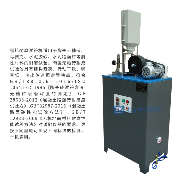 鋼輪耐磨試驗(yàn)機(jī)適用于陶瓷無(wú)釉磚、馬賽克、水泥膠砂、水泥路面磚等脆性材料的耐磨試驗(yàn)。陶瓷無(wú)釉磚耐磨試驗(yàn)儀具有結(jié)構(gòu)緊湊、傳動(dòng)平穩(wěn)、噪音低、輸出傳速恒定等特點(diǎn)。符合GB/T3810.6—2016/ISO 10545-6:1995《陶瓷磚試驗(yàn)方法-無(wú)釉磚耐磨深度的測(cè)定》,GB 28635-2012《混凝土路面磚耐磨度試驗(yàn)方》,GBT32987-2016 《混凝土路面磚性能試驗(yàn)方法》,GB/T 12988-2009《無(wú)機(jī)地面材料耐磨性能試驗(yàn)方法》對(duì)試驗(yàn)儀器的要求。更換不同磨輪可實(shí)現(xiàn)不同標(biāo)準(zhǔn)的檢測(cè),一機(jī)多用。