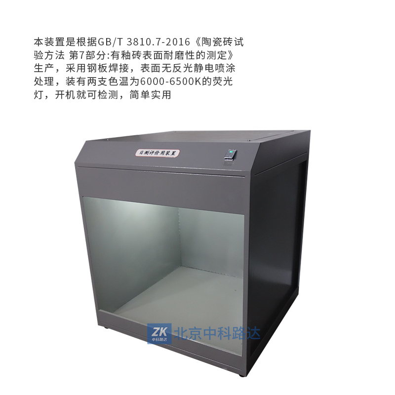 本裝置是根據(jù)GB/T 3810.7-2016《陶瓷磚試驗(yàn)方法 第7部分:有釉磚表面耐磨性的測(cè)定》生產(chǎn),采用鋼板焊接,表面無(wú)反光靜電噴涂處理,裝有兩支色溫為6000-6500K的熒光燈,開機(jī)就可檢測(cè),簡(jiǎn)單實(shí)用。