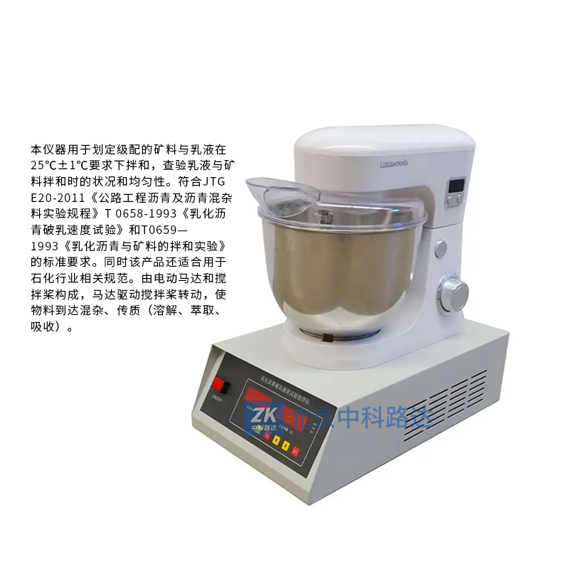 SYD-0658 乳化瀝青破乳速度攪拌機(jī)一、產(chǎn)品介紹:本儀器用于劃定級配的礦料與乳液在 25℃±1℃要求下拌和,查驗乳液與礦料拌和時的狀況和均勻性。符合JTG E20-2011《公路工程瀝青及瀝青混雜料實(shí)驗規(guī)程》T 0658-1993《乳化瀝青破乳速度試驗》和T0659—1993《乳化瀝青與礦料的拌和實(shí)驗》的標(biāo)準(zhǔn)要求。同時該產(chǎn)品還適合用于石化行業(yè)相關(guān)規(guī)范。由電動馬達(dá)和攪拌槳構(gòu)成,馬達(dá)驅(qū)動攪拌槳轉(zhuǎn)動,使物料到達(dá)混雜、傳質(zhì)(溶解、萃取、吸收)。