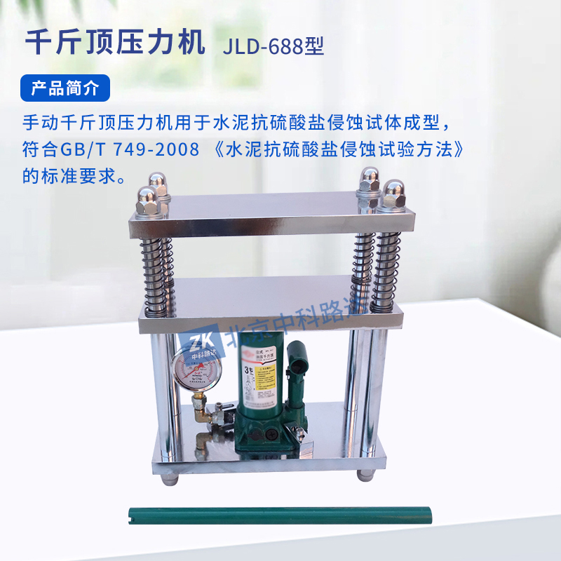手動千斤頂壓力機用于水泥抗硫酸鹽侵蝕試體成型,符合GB/T 749-2008 《水泥抗硫酸鹽侵蝕試驗方法》的標準要求。...