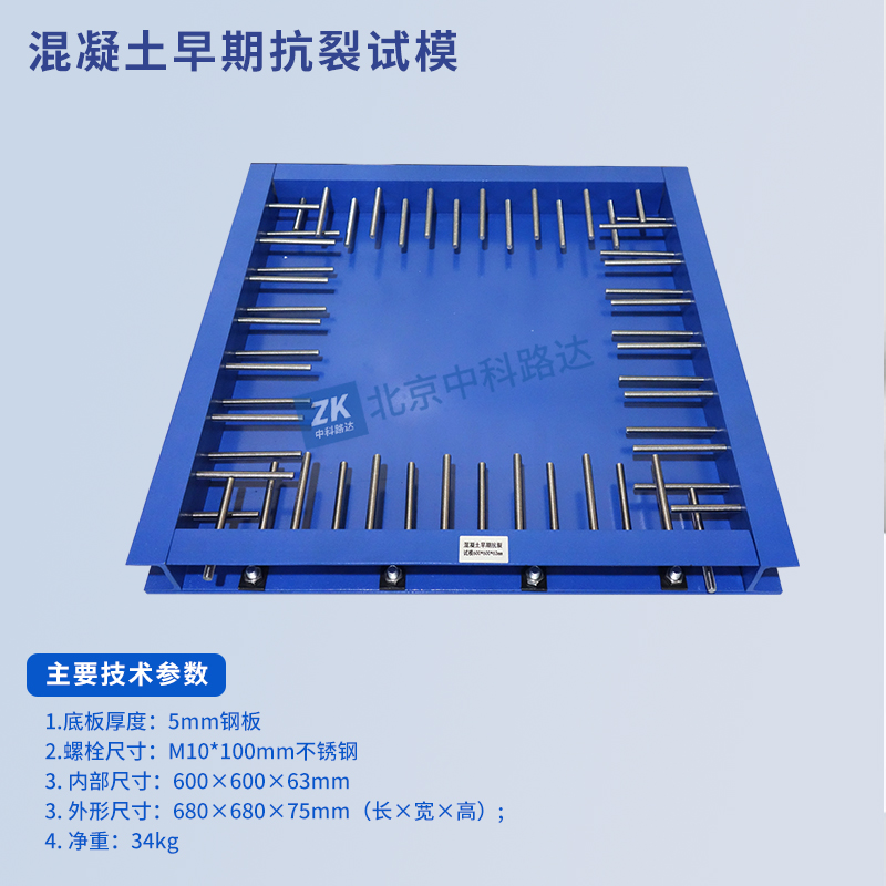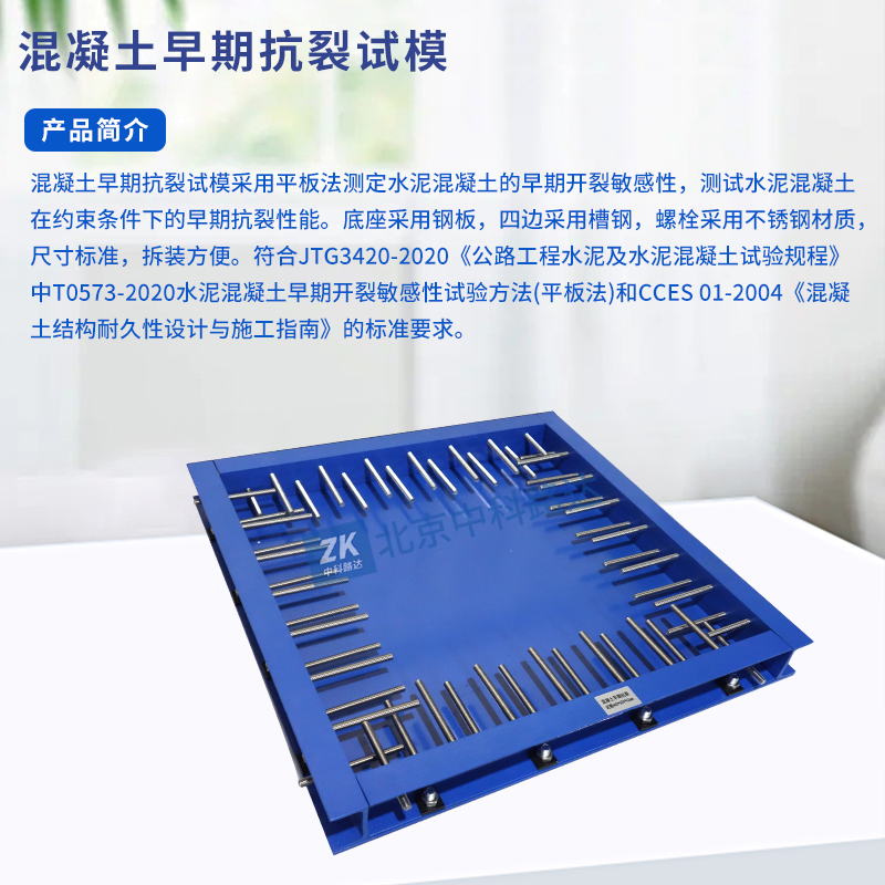 混凝土早期抗裂試模采用平板法測定水泥混凝土的早期開裂敏感性,測試水泥混凝土在約束條件下的早期抗裂性能。底座采用鋼板,四邊采用槽鋼,螺栓采用不銹鋼材質(zhì),尺寸標(biāo)準(zhǔn),拆裝方便。符合JTG3420-2020《公路工程水泥及水泥混凝土試驗規(guī)程》中T0573-2020水泥混凝土早期開裂敏感性試驗方法(平板法)和CCES 01-2004《混凝土結(jié)構(gòu)耐久性設(shè)計與施工指南》的標(biāo)準(zhǔn)要求。...