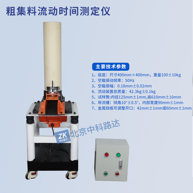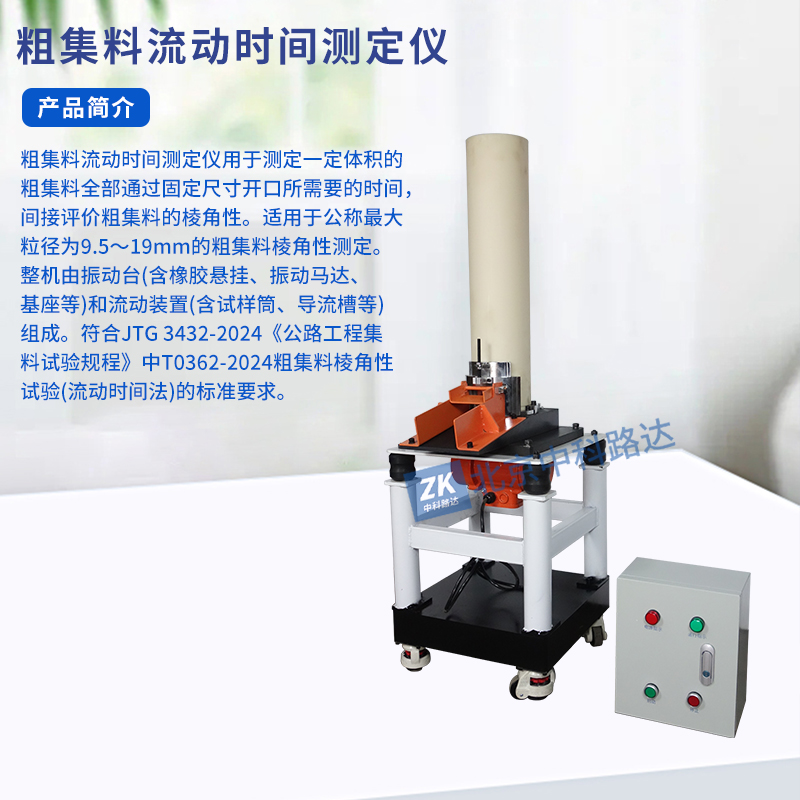 粗集料流動(dòng)時(shí)間測(cè)定儀用于測(cè)定一定體積的粗集料全部通過固定尺寸開口所需要的時(shí)間,間接評(píng)價(jià)粗集料的棱角性。適用于公稱最大粒徑為9.5~19mm的粗集料棱角性測(cè)定整機(jī)由振動(dòng)臺(tái)(含橡膠懸掛、振動(dòng)馬達(dá)、基座等)和流動(dòng)裝置(含試樣筒、導(dǎo)流槽等)組成。符合JTG 3432-2024《公路工程集料試驗(yàn)規(guī)程》T0362-2024粗集料棱角性試驗(yàn)(流動(dòng)時(shí)間法)的標(biāo)準(zhǔn)要求。