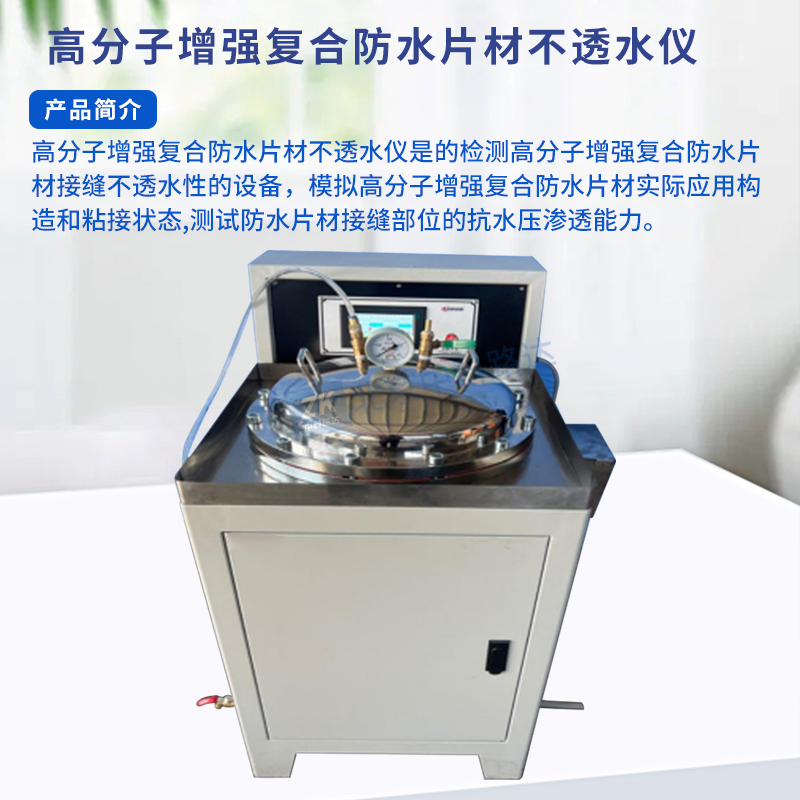 高分子增強復合防水片材不透水儀是的檢測高分子增強復合防水片材接縫不透水性的設備,模擬高分子增強復合防水片材實際應用構(gòu)造和粘接狀態(tài),測試防水片材接縫部位的抗水壓滲透能力。本產(chǎn)品采用電動水泵加壓,具有自動保持壓力、自動計時等功能。符合GB/T26518-2023《高分子增強復合防水片材》的標準要求。