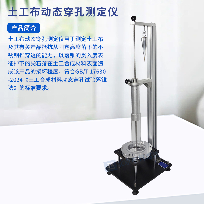 土工布動態(tài)穿孔測定儀用于測定土工布及其有關(guān)產(chǎn)品抵抗從固定高度落下的不銹鋼錐穿透的能力,以落錐的貫入度表征掉下的尖石落在土工合成材料表面造成該產(chǎn)品的損壞程度。符合GB/T 17630-2024土工合成材料動態(tài)穿孔試驗(yàn)落錐法》的標(biāo)準(zhǔn)要求。